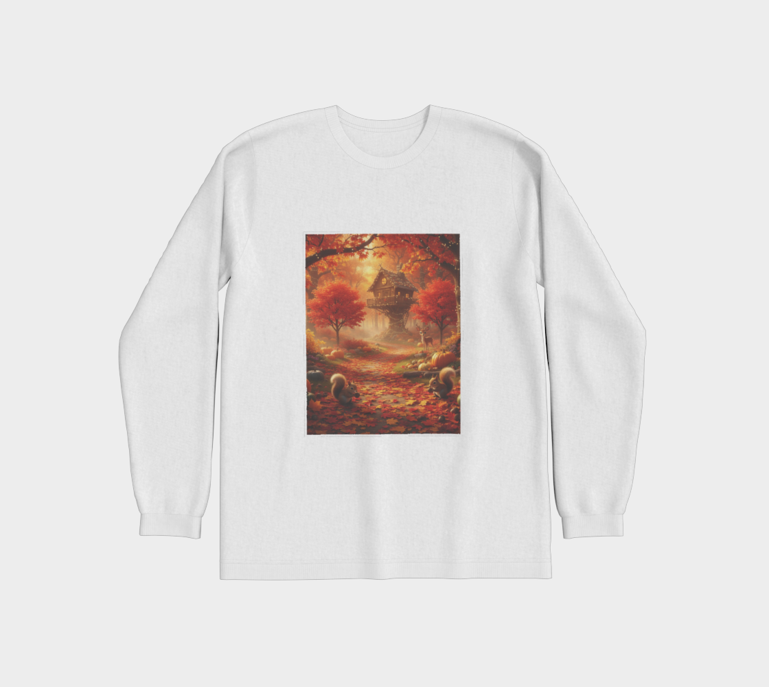 Step into the magic of a Canadian Autumn! This captivating, high-contrast, square art print depicts an enchanted forest scene perfect for inspiring the imaginations of mothers and children (Ages 5-12). A sun-drenched path covered in red and gold maple leaves leads to a cozy, glowing treehouse decorated with soft fairy lights. The foreground features charming, animated squirrels, a gentle forest deer, and an abundant display of harvest pumpkins. This 600dpi, pristine image captures the spirit of discovery, nature, and the cozy joy of the Canadian fall season. A unique piece of Thanksgiving or everyday seasonal art.